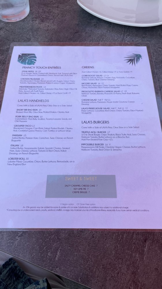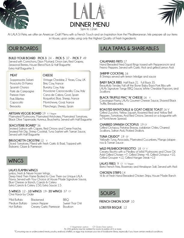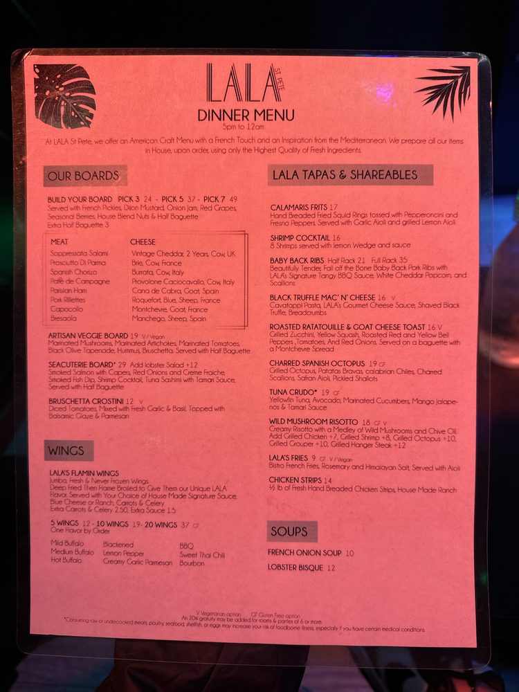 LALA St Pete is a trendy Mediterranean restaurant in St. Petersburg, FL, offering a unique blend of dining, entertainment, and karaoke. The restaurant is known for its casual yet classy atmosphere, with outdoor seating and a full bar. Customers rave about the delicious food, with menu highlights like wings, bruschetta, calamari, fish dishes, and soups. The karaoke setup, including private rooms with a vast song library, adds a fun and interactive element to the dining experience. With positive reviews from customers praising the friendly service and top-notch cocktails, LALA St Pete is a must-visit destination for a memorable night out with friends or a special celebration. So, if you're looking for a lively spot with great food and entertainment, LALA St Pete is the place to be.